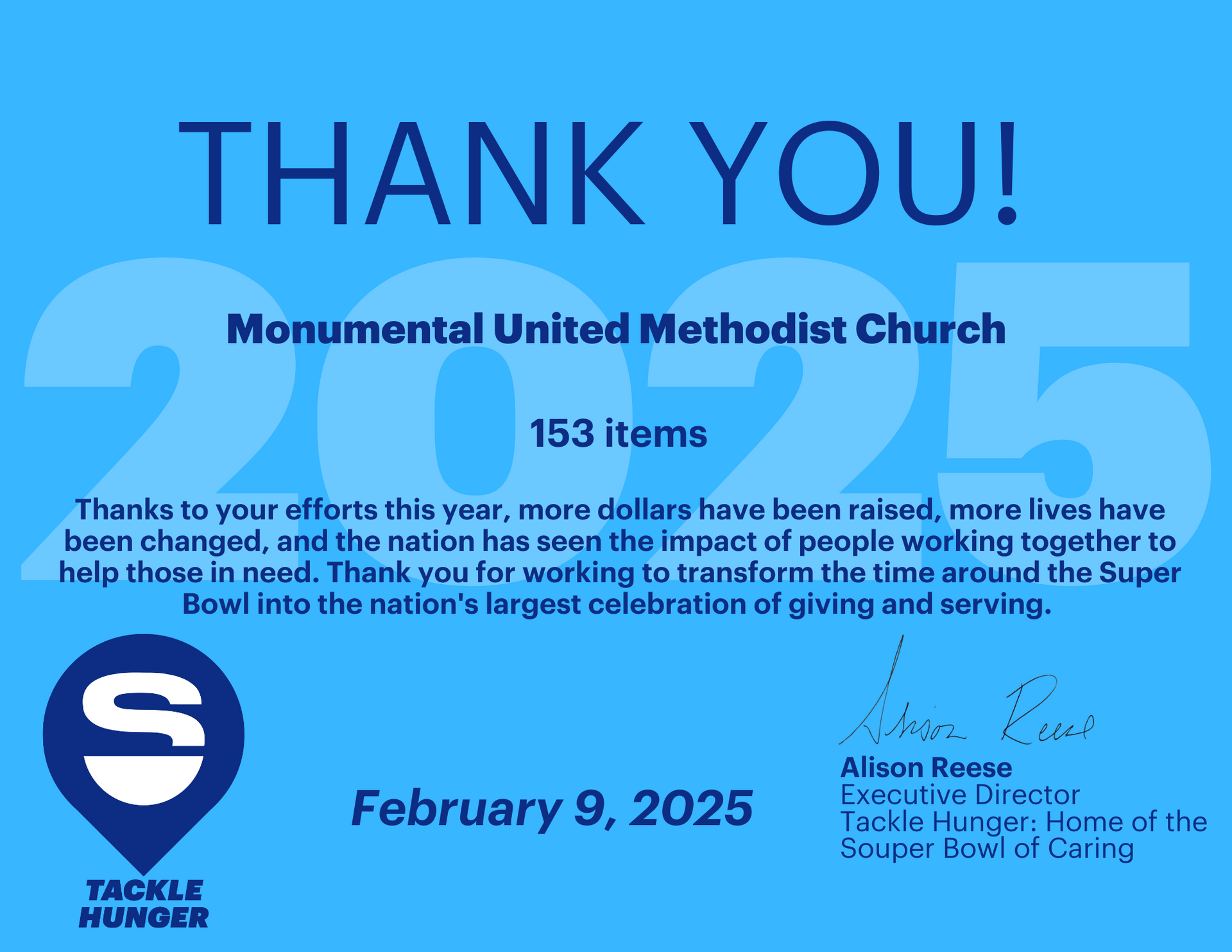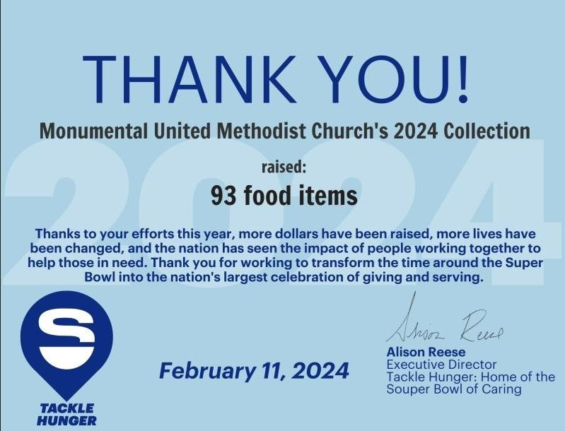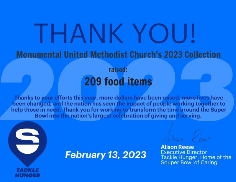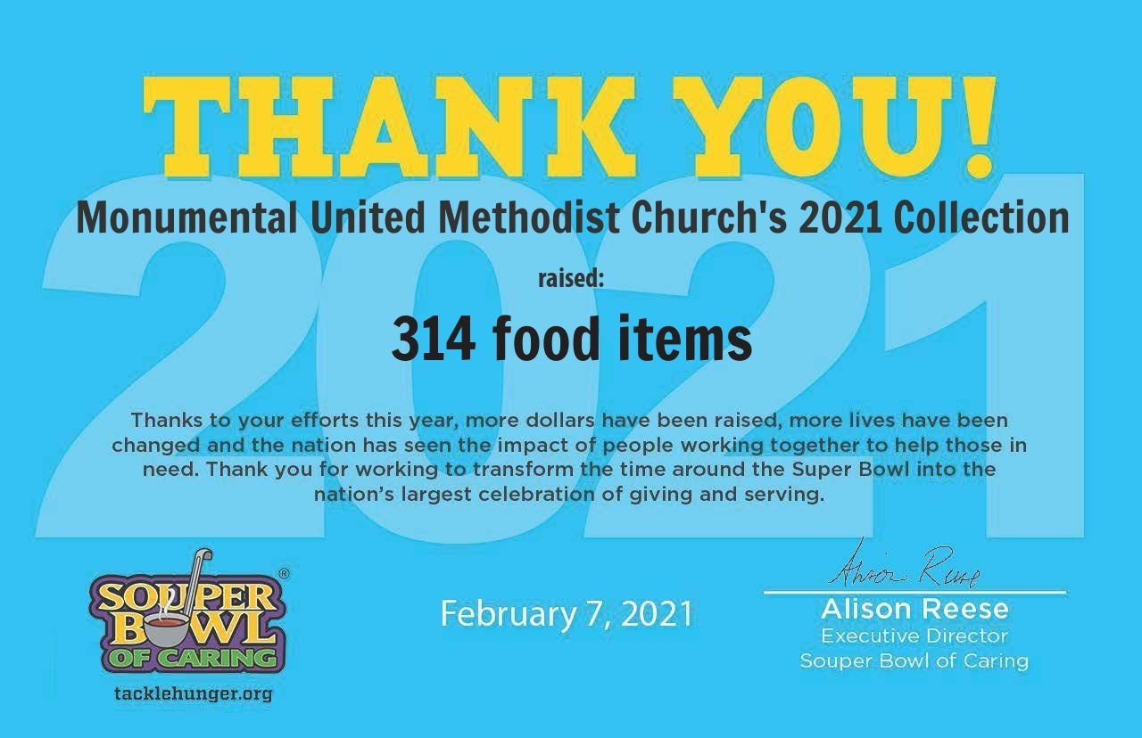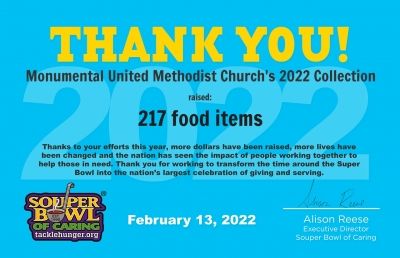 Monumental collected canned food and other non-perishable items for the "Souper" Bowl again this year!