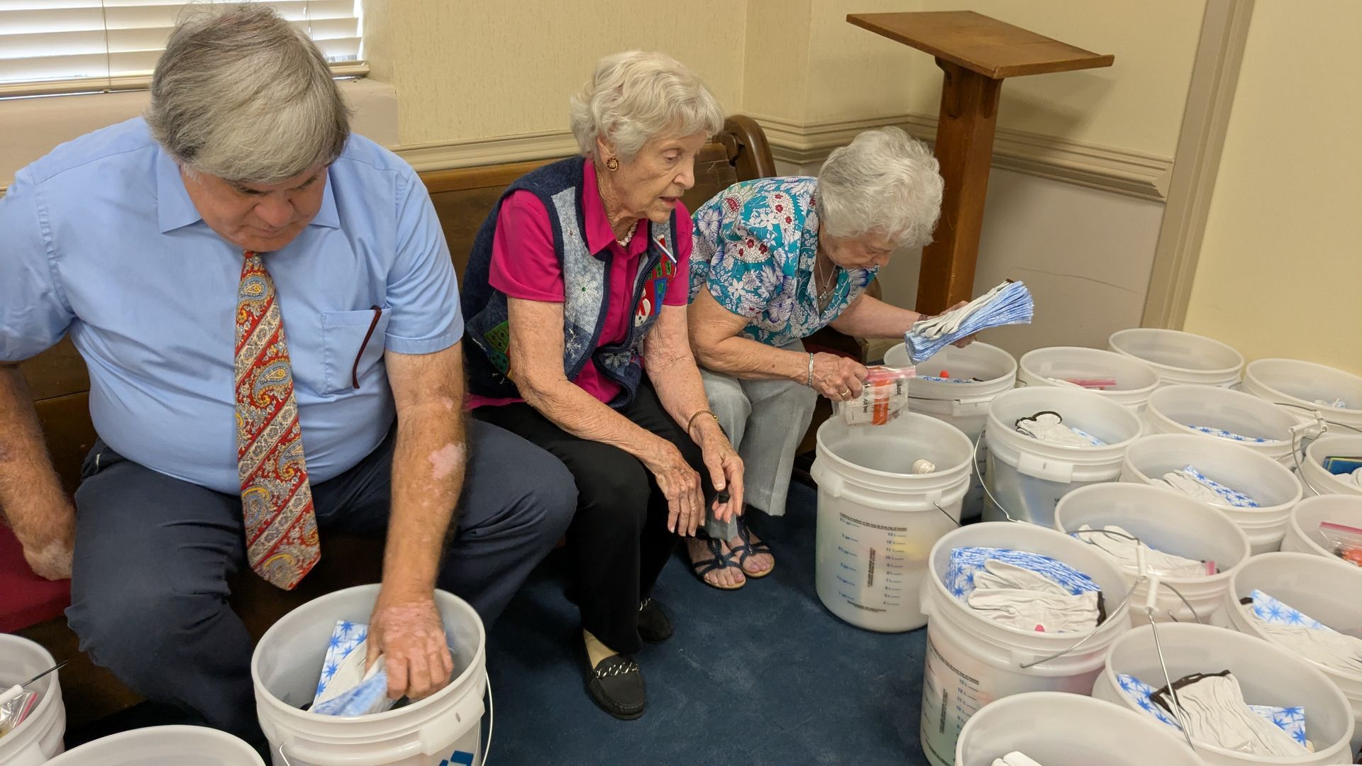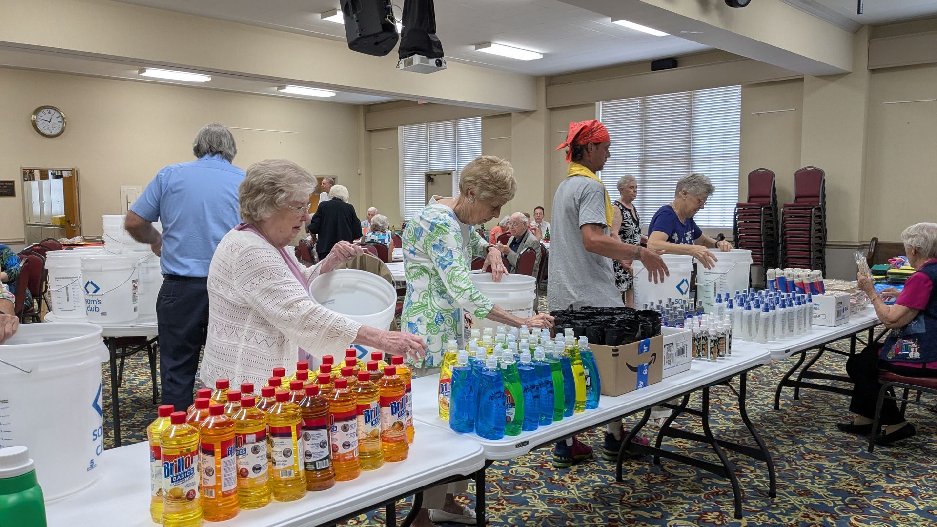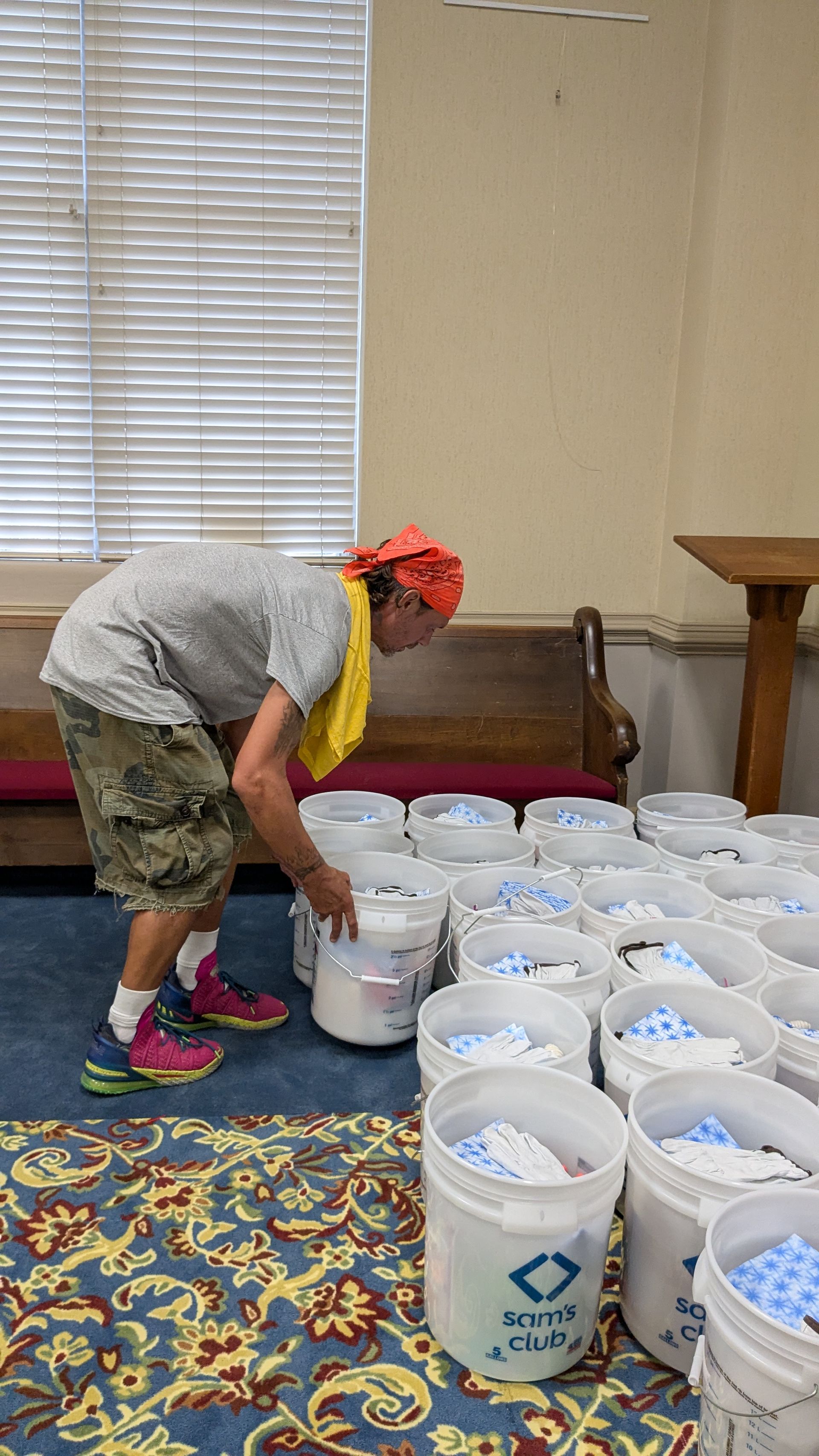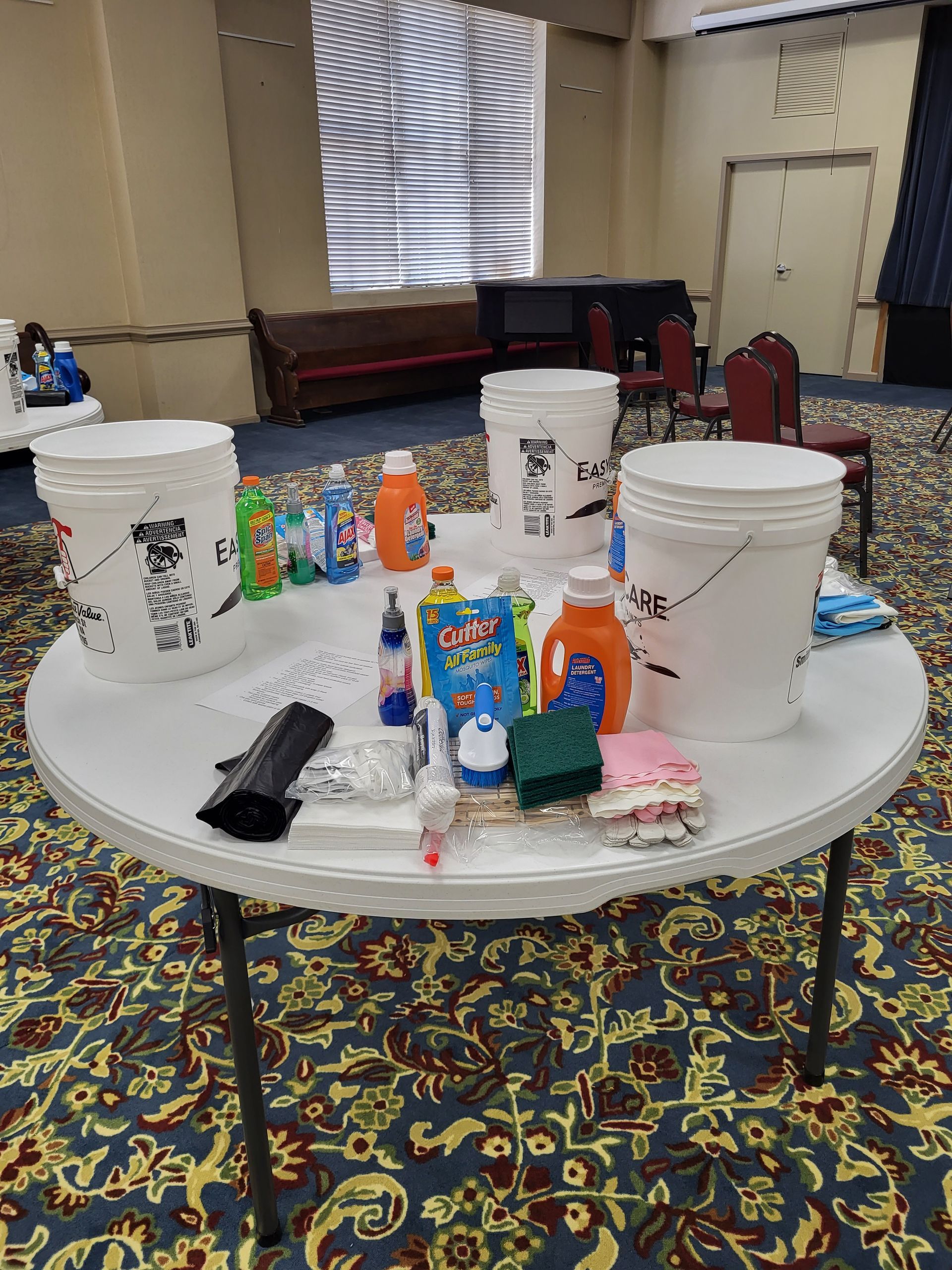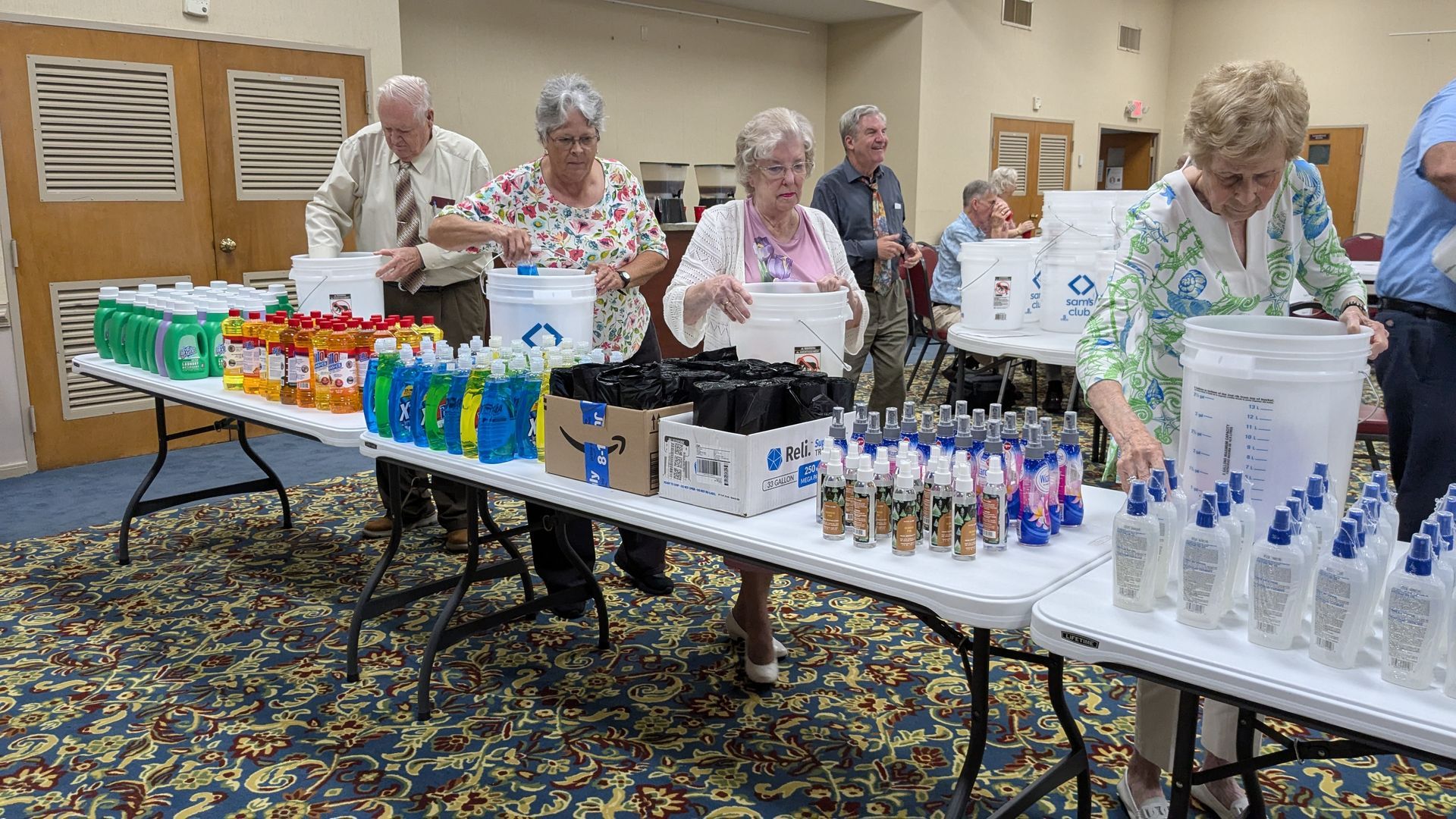 On July 27, following the Christmas in July worship service and congregational luncheon, 35 flood/cleaning buckets were assembled as a churchwide project for Outreach. These buckets include supplies that are greatly needed for cleanup in areas which have suffered major flooding. They will go to the United Methodist Committee on Relief (UMCOR) when the District is ready to receive them.