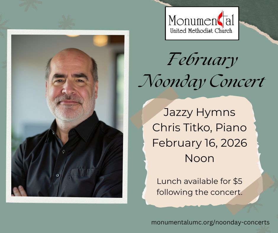 Monumental offers a free Noonday Concert Series celebrating local musicians. These concerts usually happen on the last Monday of the month between February and April and again between September and November. Each half-hour recital begins at noon. Lunch is typically available for $5 following each concert.